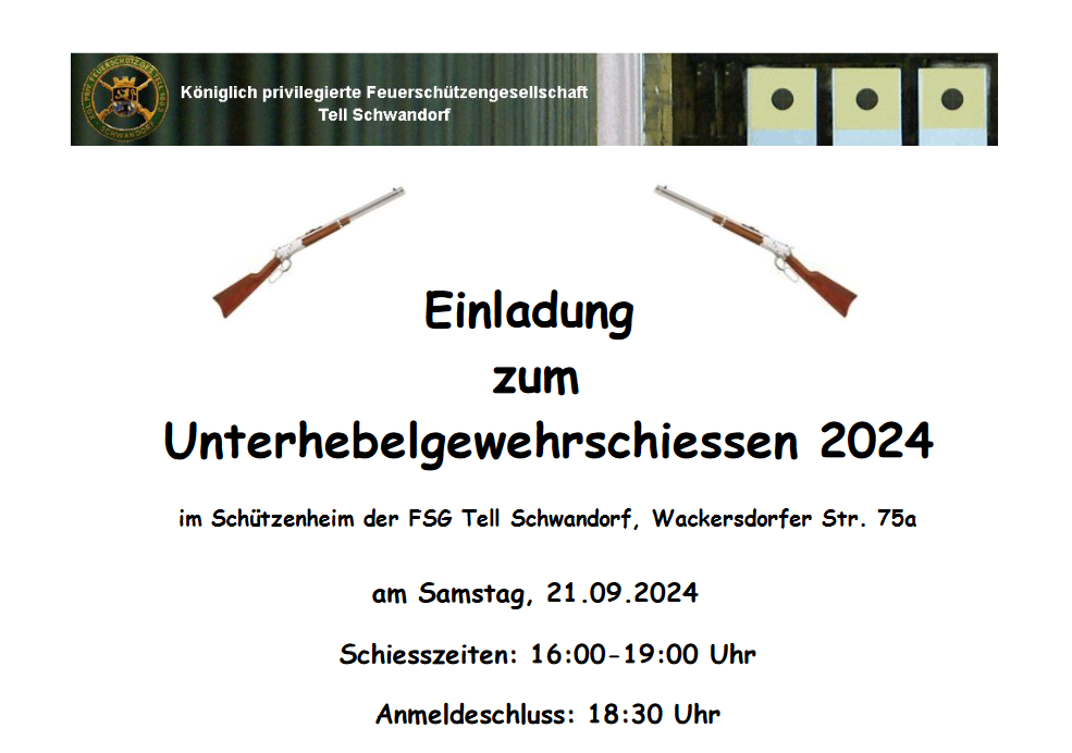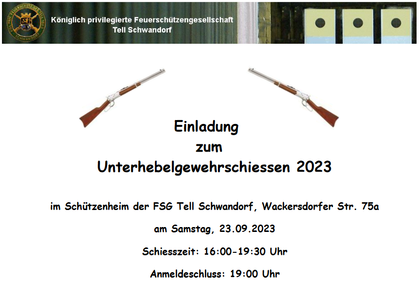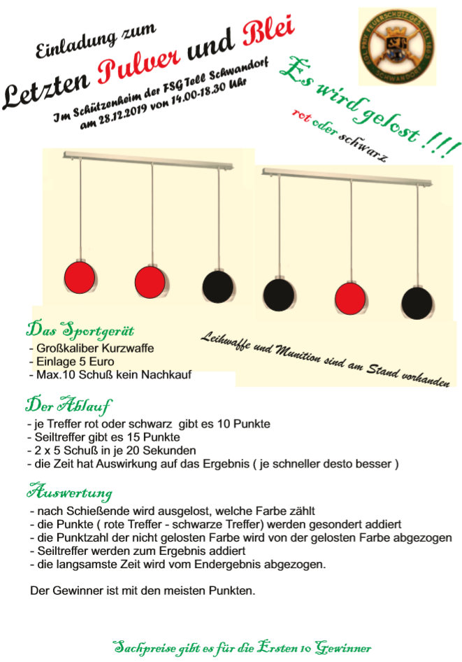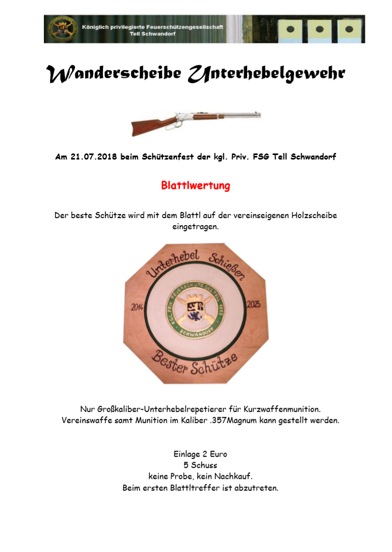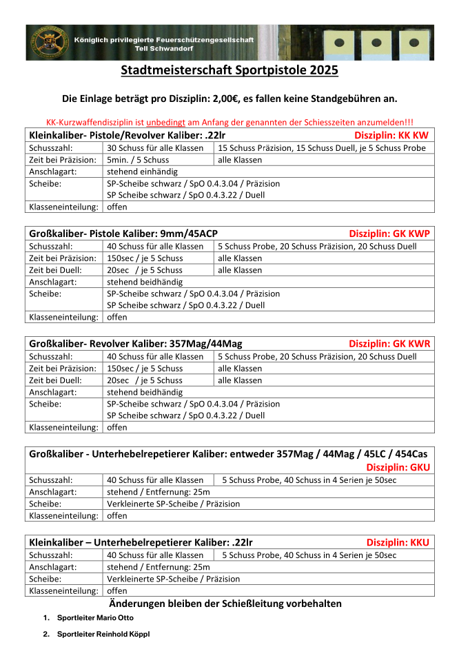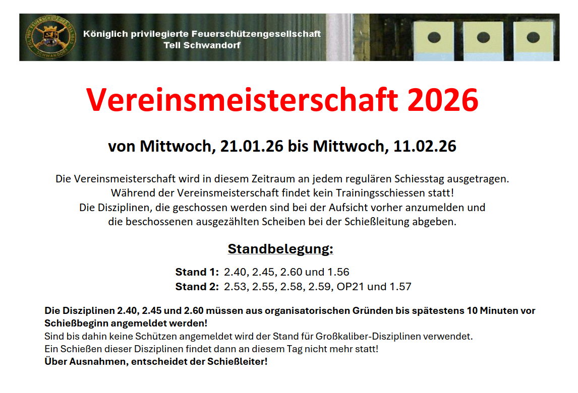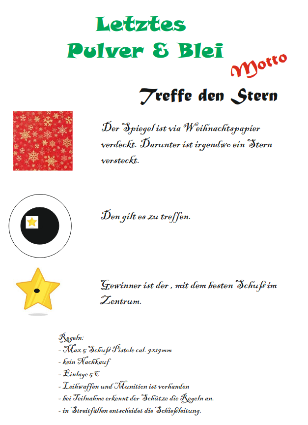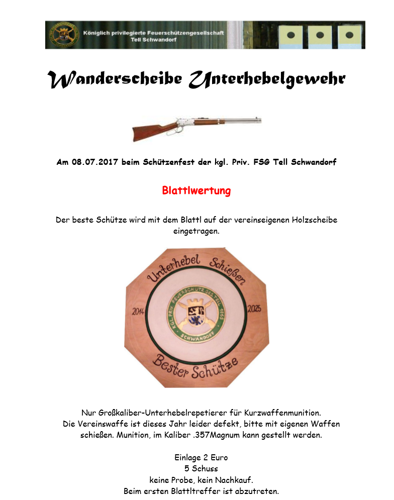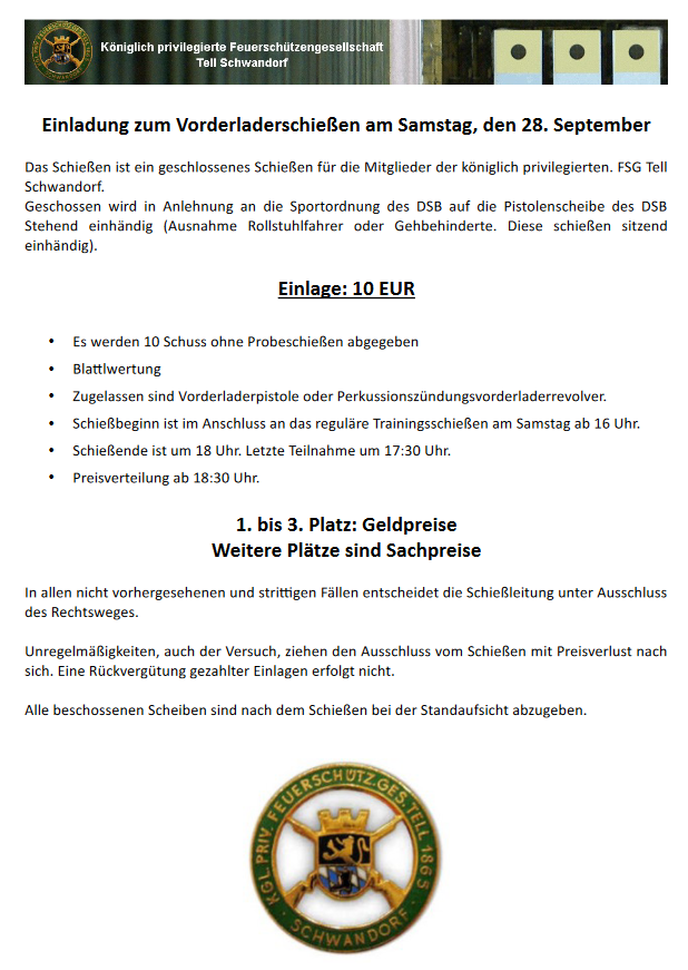 Geschossen werden jeweils 13 Schuss mit 9mm Pistole auf 25m und halbautomatische Büchse auf 100m. Die besten 10 Schuss werden gewertet. Es gibt Mannschafts- und Einzelwertung. Eine Manschafft besteht aus drei Personen. Benötigte Munition wird gestellt. Abfahrt am 02.10. um 8:00 am Schützenheim. Interessenten bitte beim Schützemeister oder Schießleiter melden.