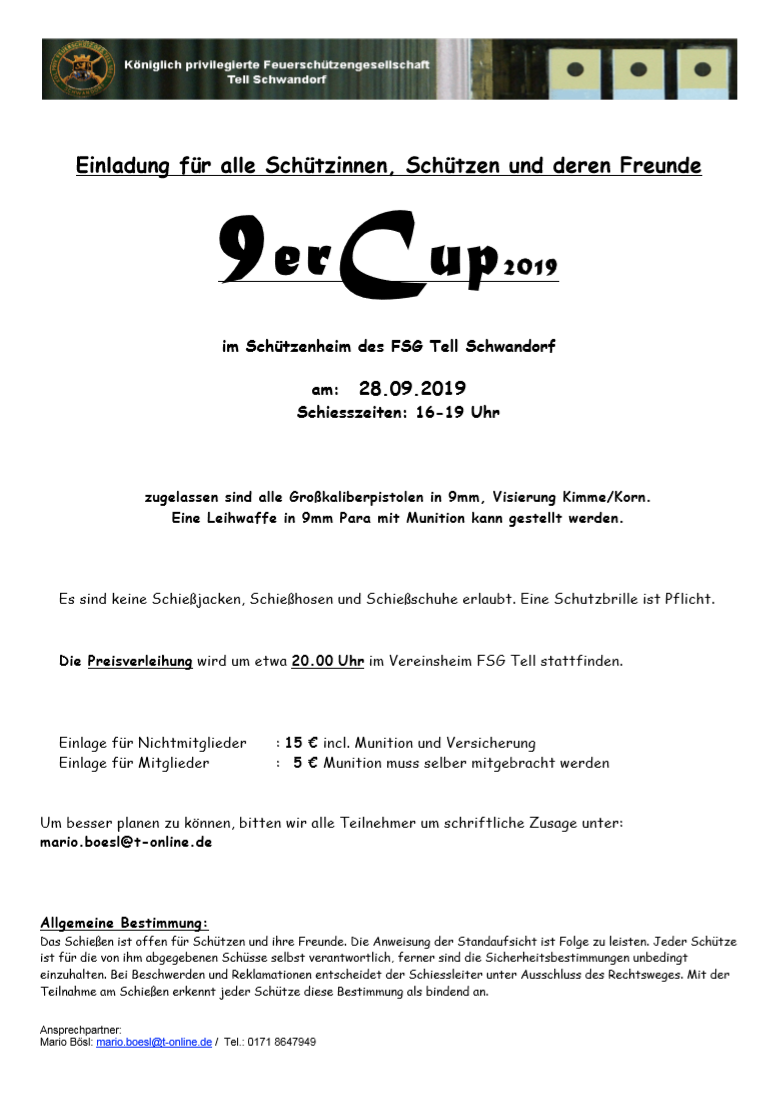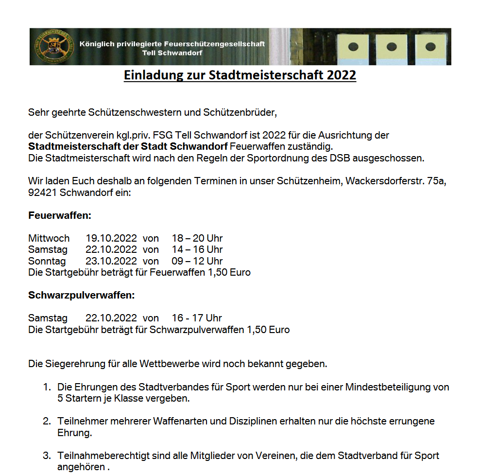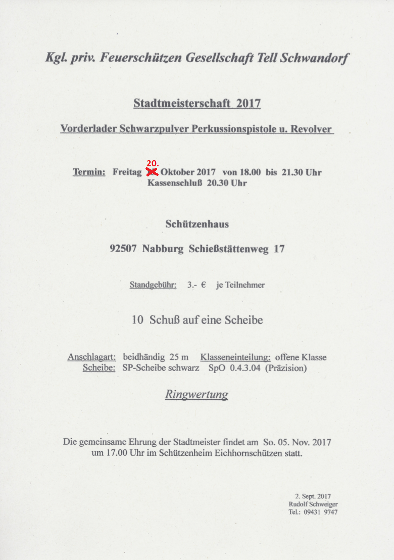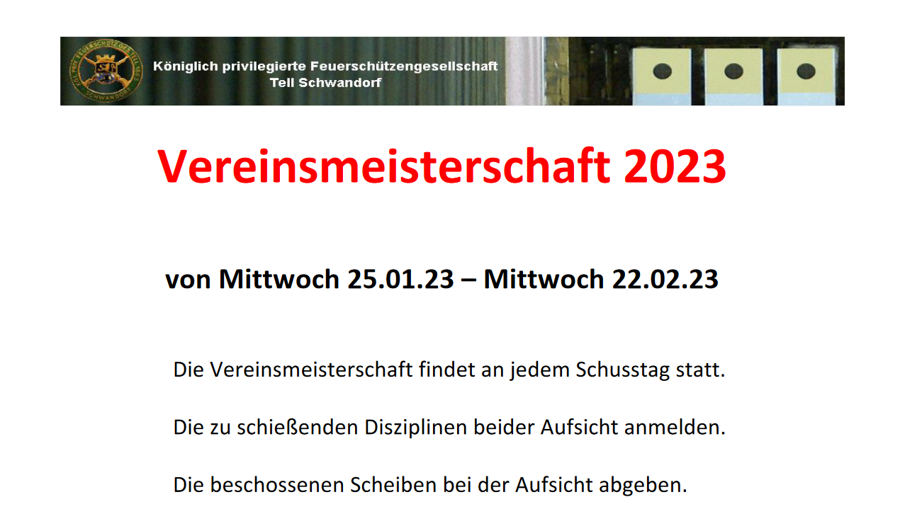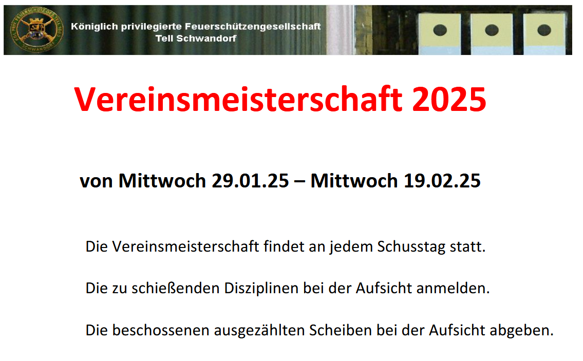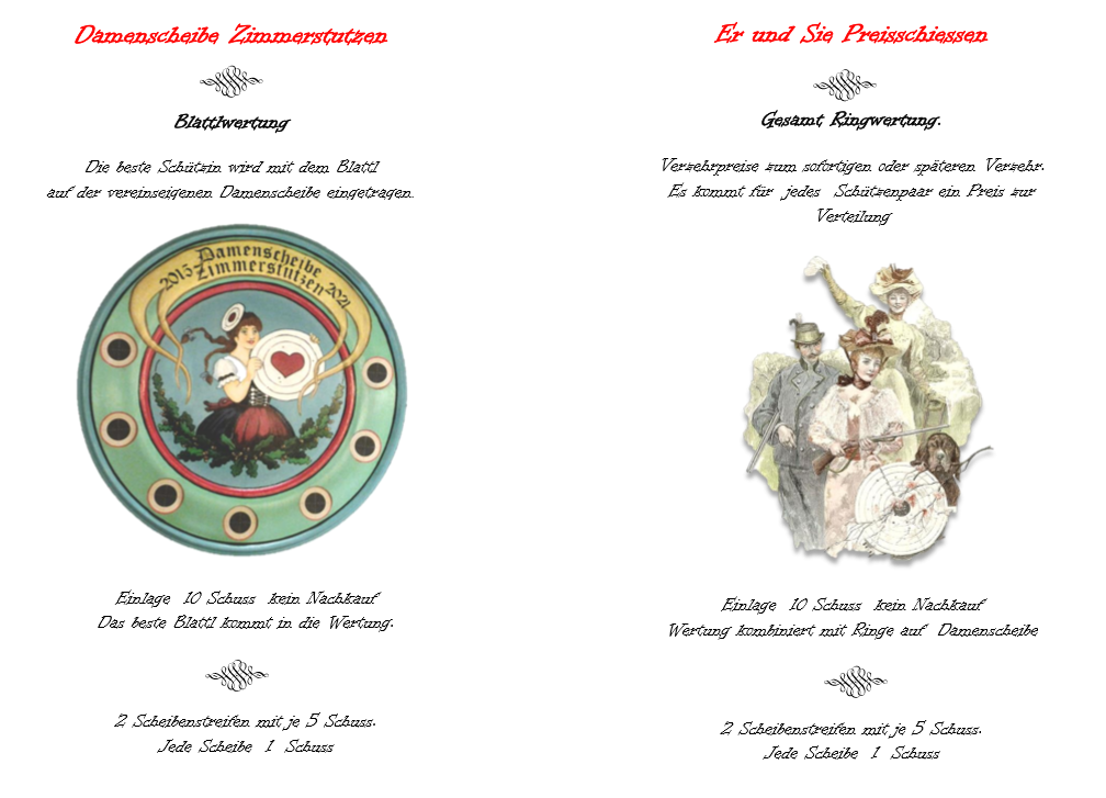 Geschossen werden jeweils 13 Schuss mit 9mm Pistole auf 25m und halbautomatische Büchse auf 100m. Die besten 10 Schuss werden gewertet. Es gibt Mannschafts- und Einzelwertung. Eine Manschafft besteht aus drei Personen. Benötigte Munition wird gestellt. Abfahrt am 02.10. um 8:00 am Schützenheim. Interessenten bitte beim Schützemeister oder Schießleiter melden.