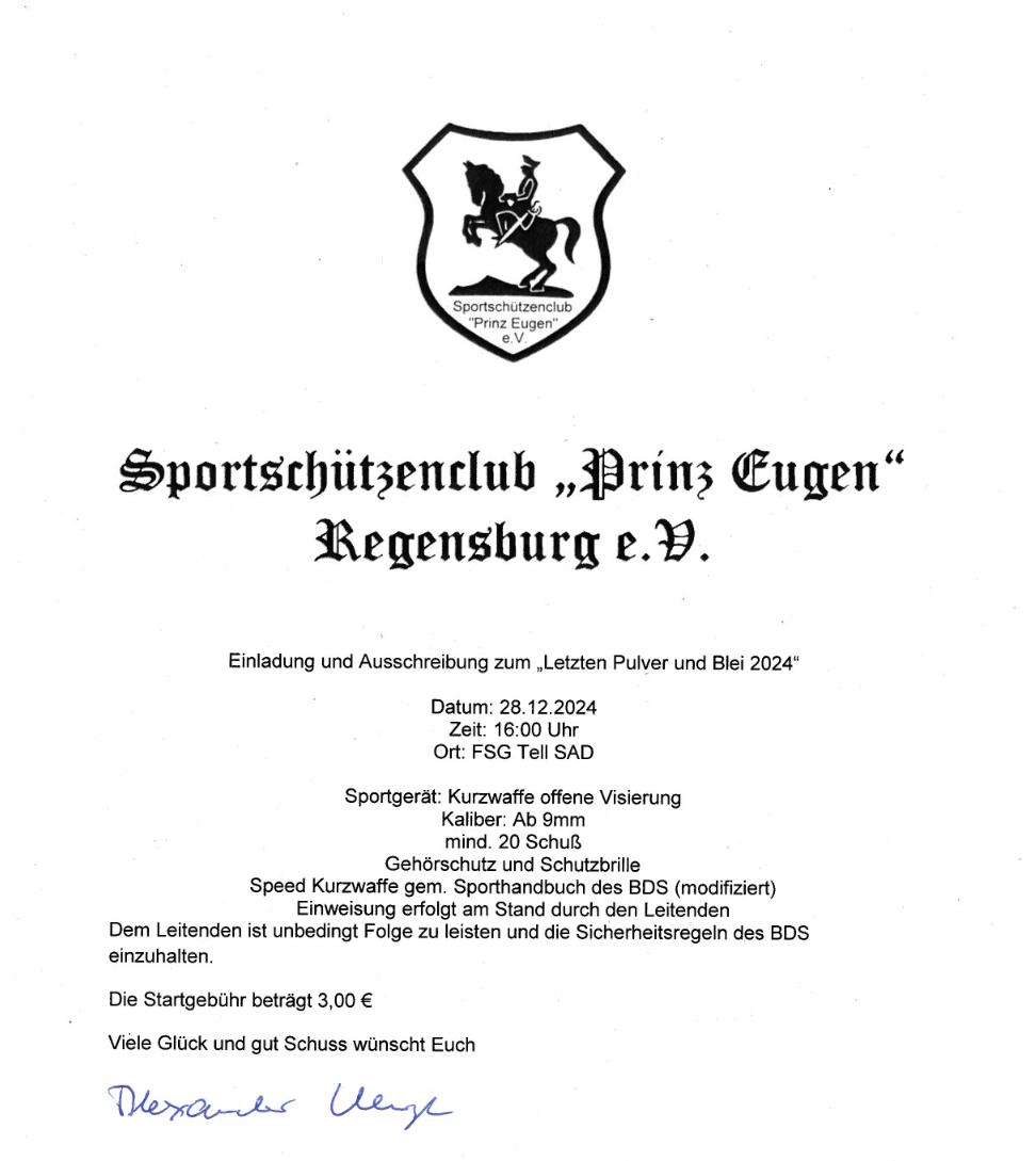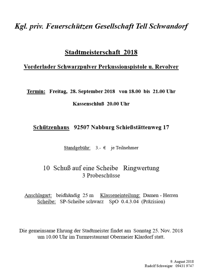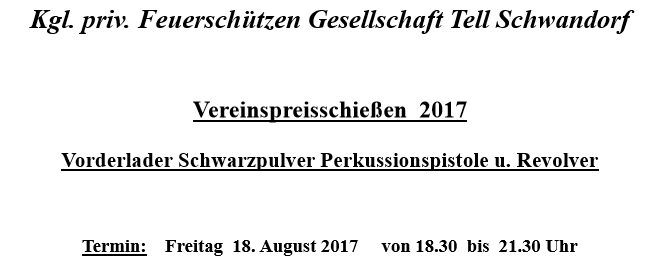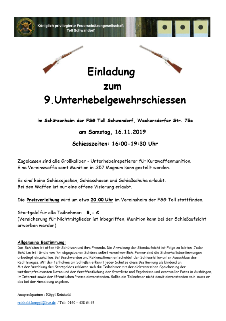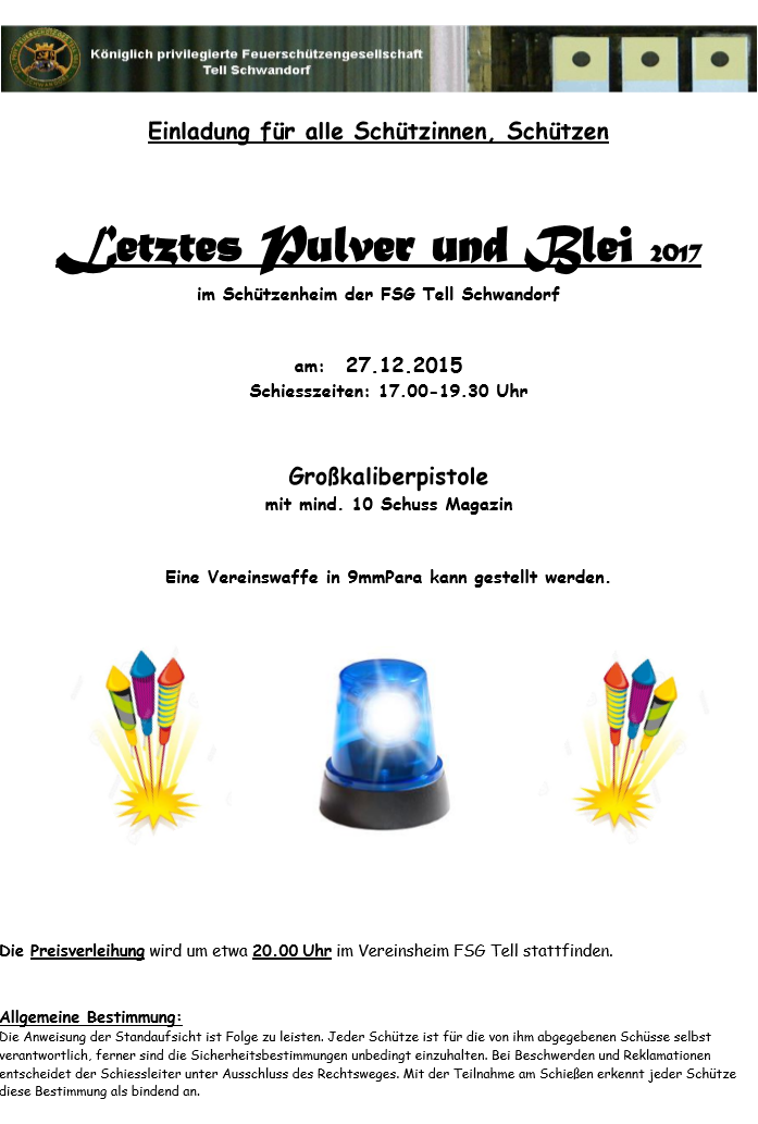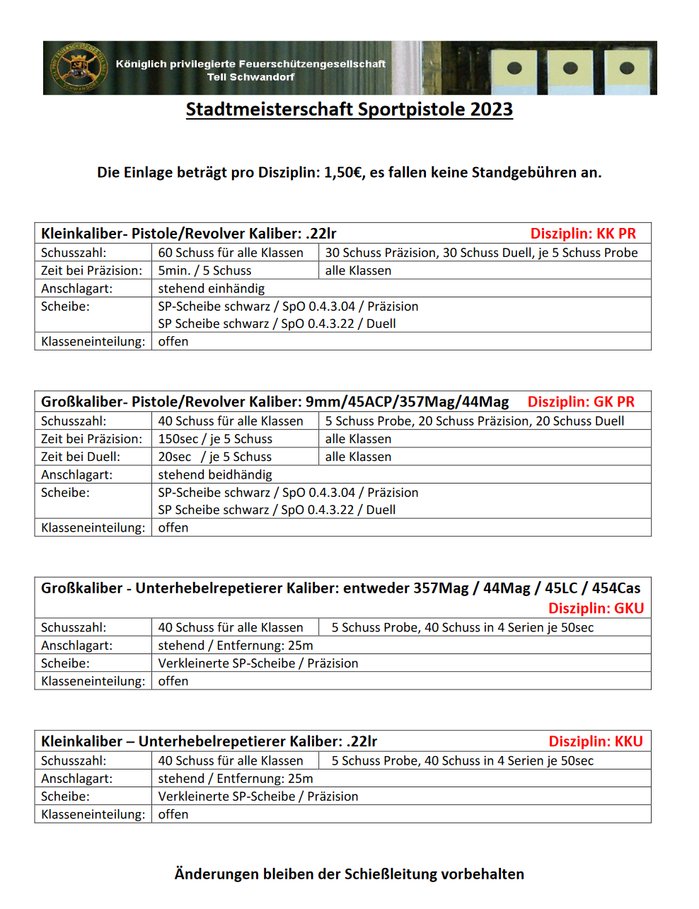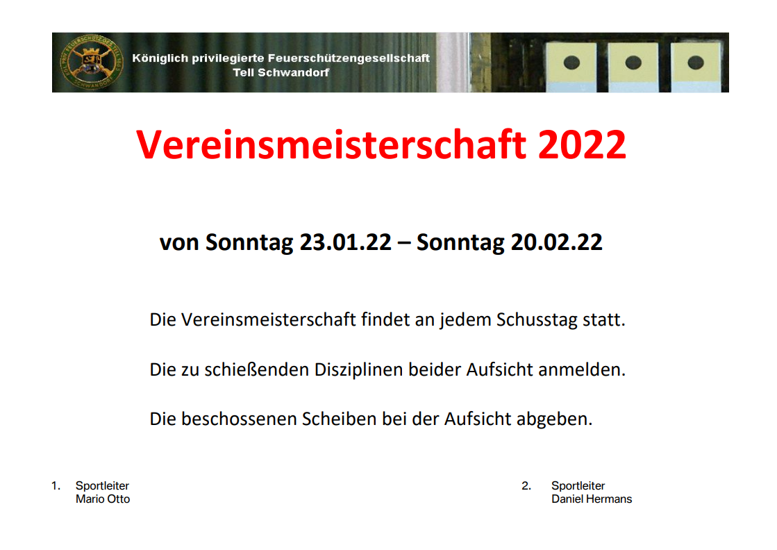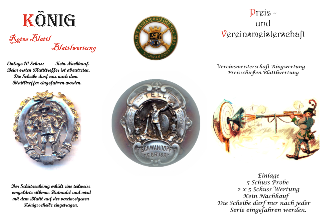 Geschossen werden jeweils 13 Schuss mit 9mm Pistole auf 25m und halbautomatische Büchse auf 100m. Die besten 10 Schuss werden gewertet. Es gibt Mannschafts- und Einzelwertung. Eine Manschafft besteht aus drei Personen. Benötigte Munition wird gestellt. Abfahrt am 02.10. um 8:00 am Schützenheim. Interessenten bitte beim Schützemeister oder Schießleiter melden.