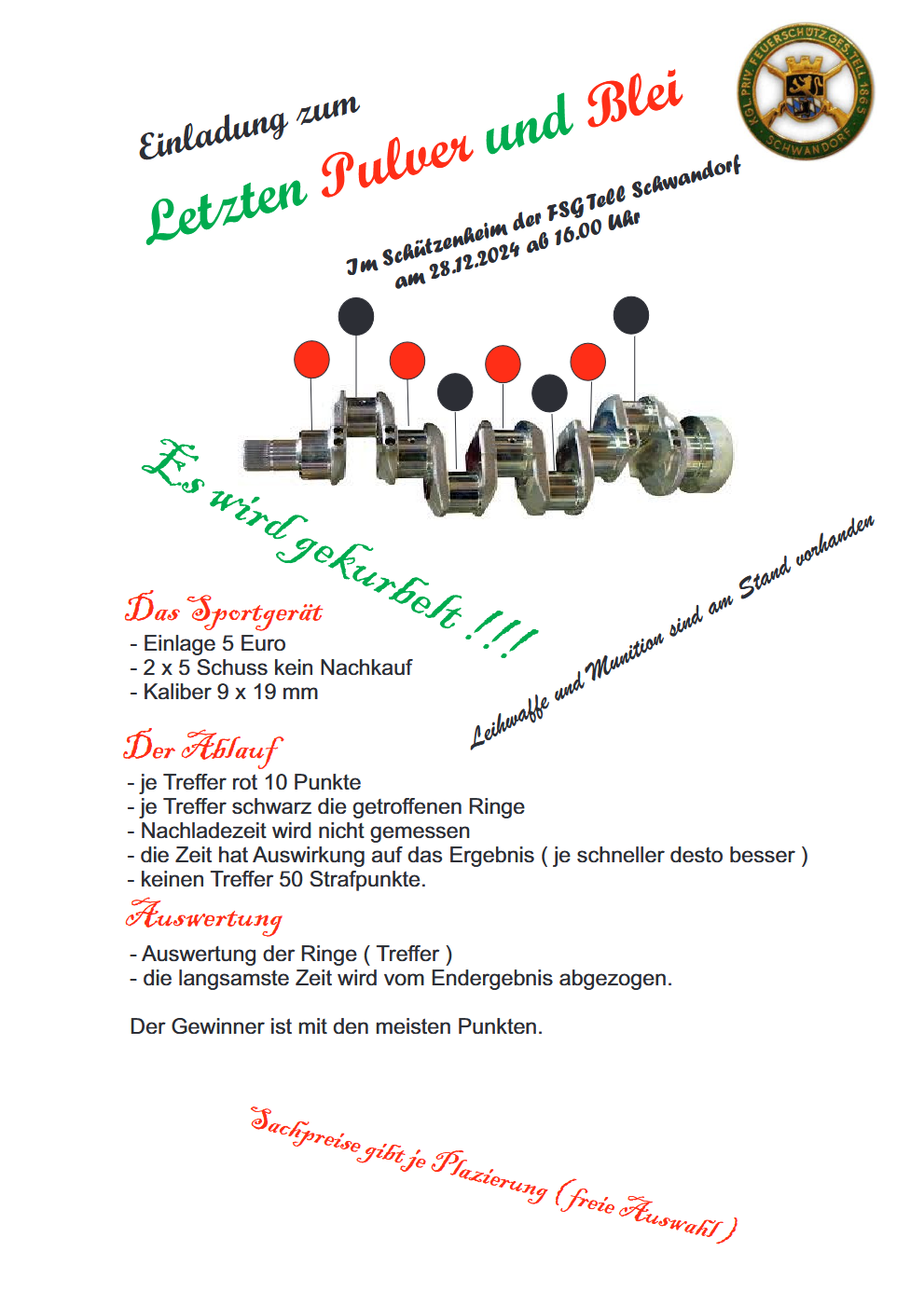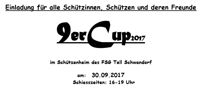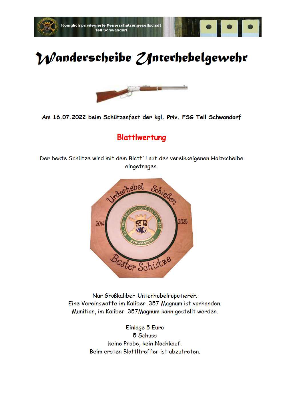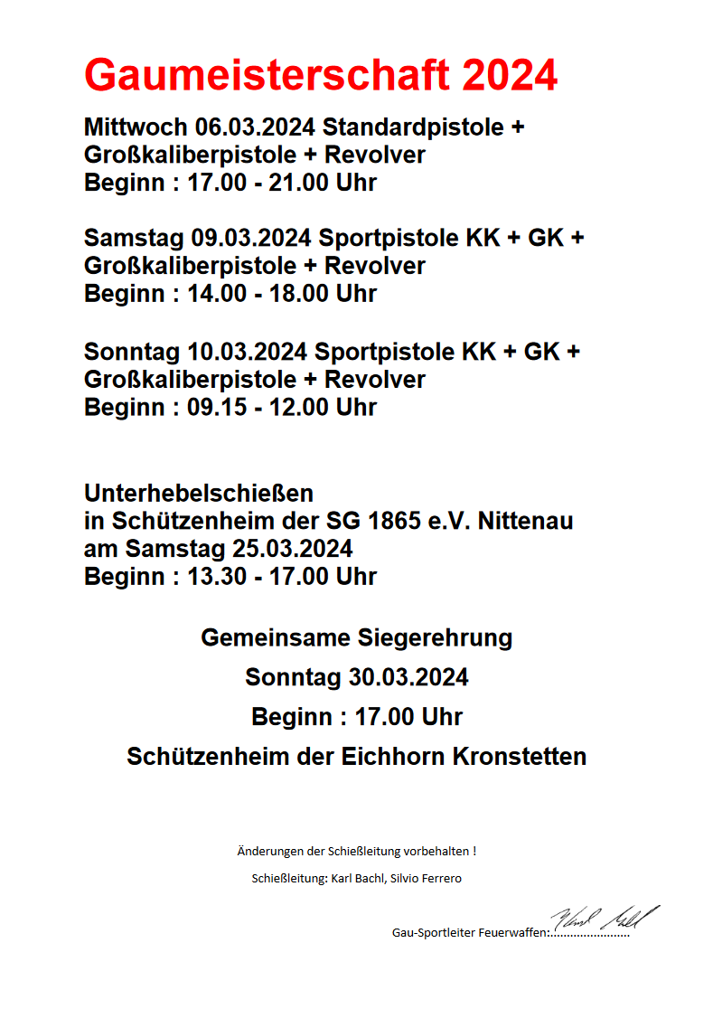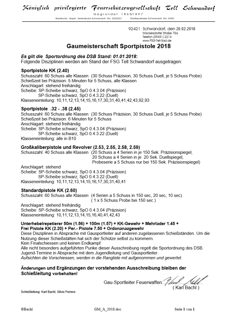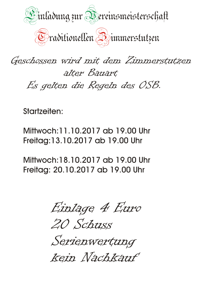 Geschossen werden jeweils 13 Schuss mit 9mm Pistole auf 25m und halbautomatische Büchse auf 100m. Die besten 10 Schuss werden gewertet. Es gibt Mannschafts- und Einzelwertung. Eine Manschafft besteht aus drei Personen. Benötigte Munition wird gestellt. Abfahrt am 02.10. um 8:00 am Schützenheim. Interessenten bitte beim Schützemeister oder Schießleiter melden.