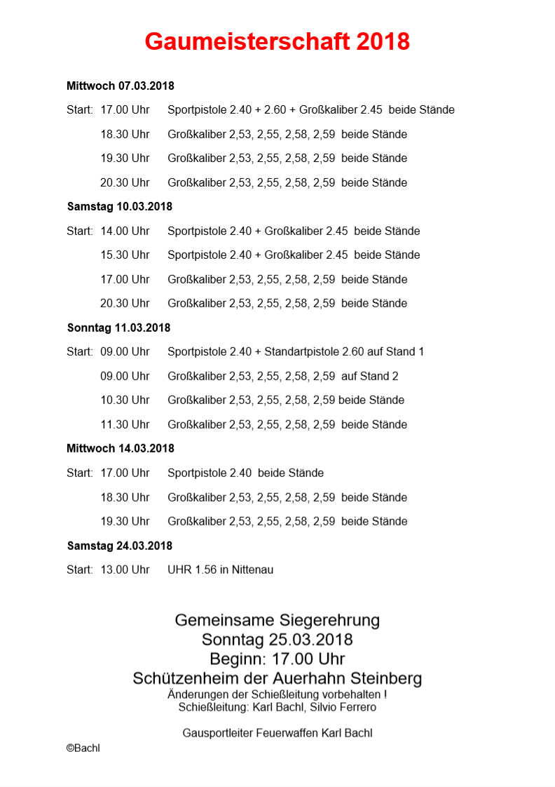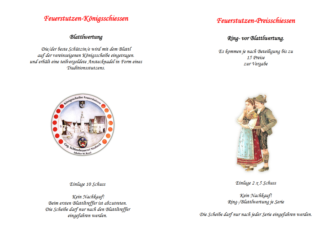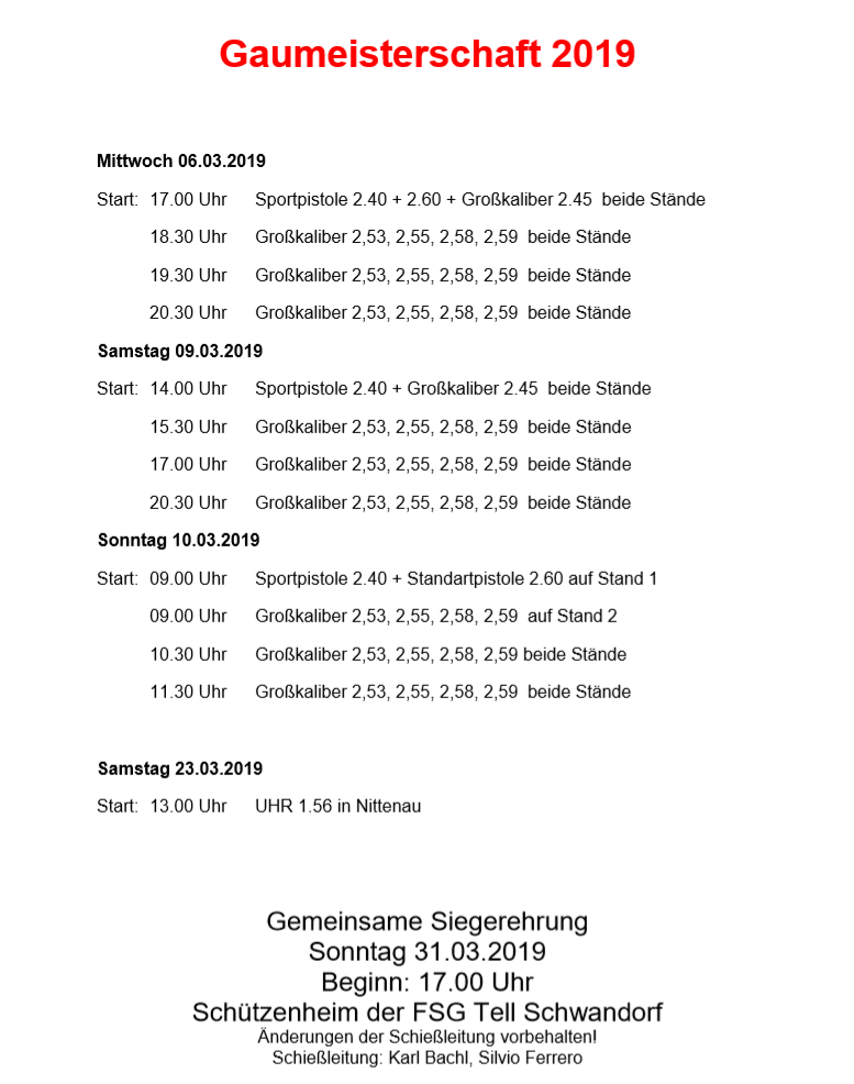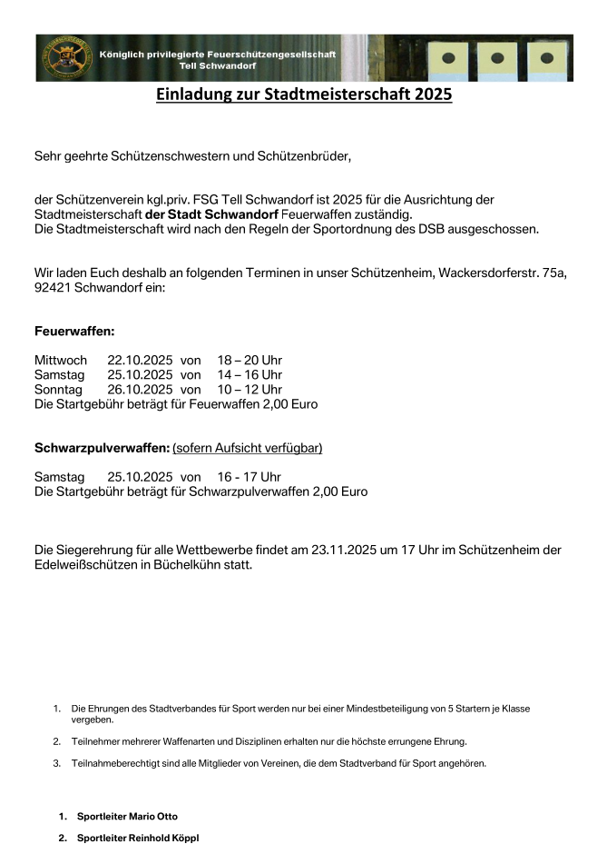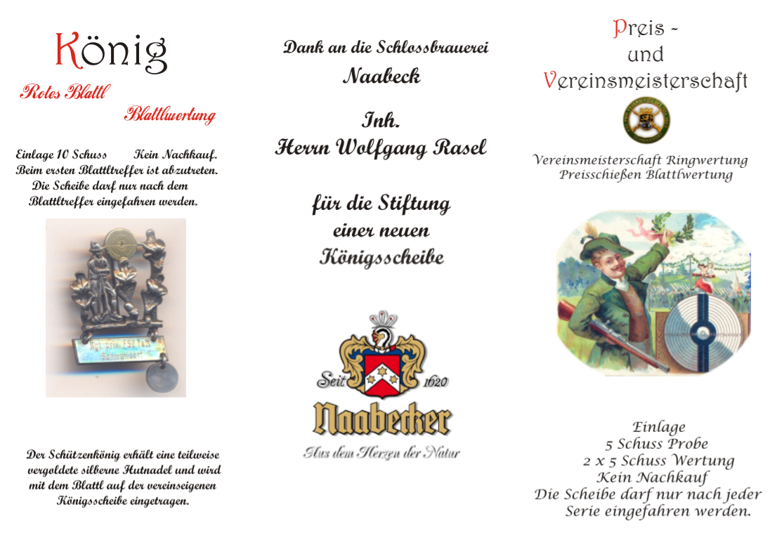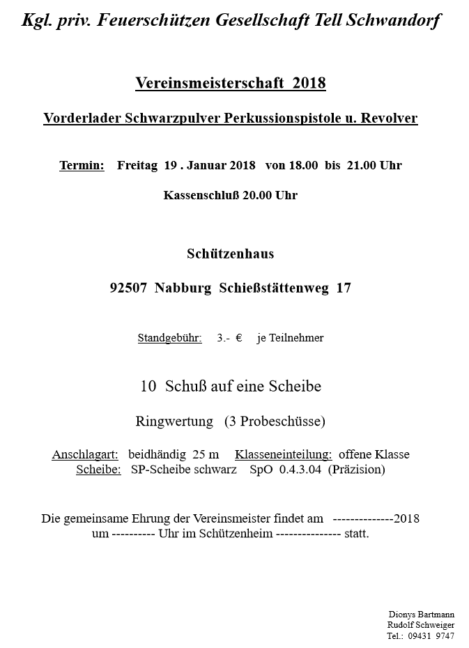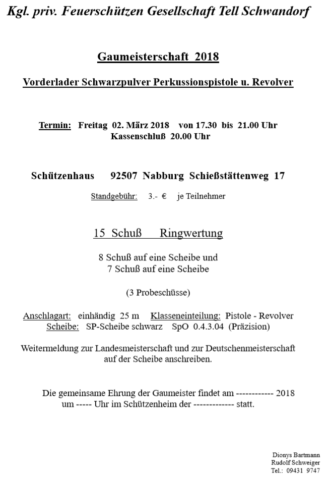 Geschossen werden jeweils 13 Schuss mit 9mm Pistole auf 25m und halbautomatische Büchse auf 100m. Die besten 10 Schuss werden gewertet. Es gibt Mannschafts- und Einzelwertung. Eine Manschafft besteht aus drei Personen. Benötigte Munition wird gestellt. Abfahrt am 02.10. um 8:00 am Schützenheim. Interessenten bitte beim Schützemeister oder Schießleiter melden.