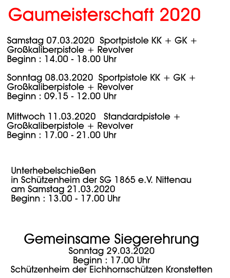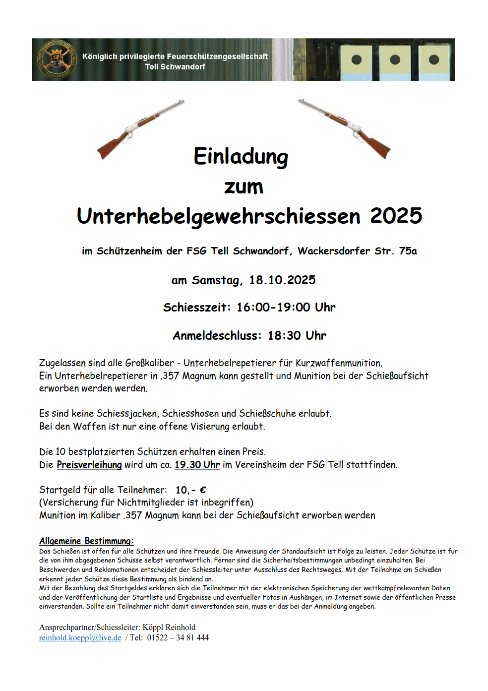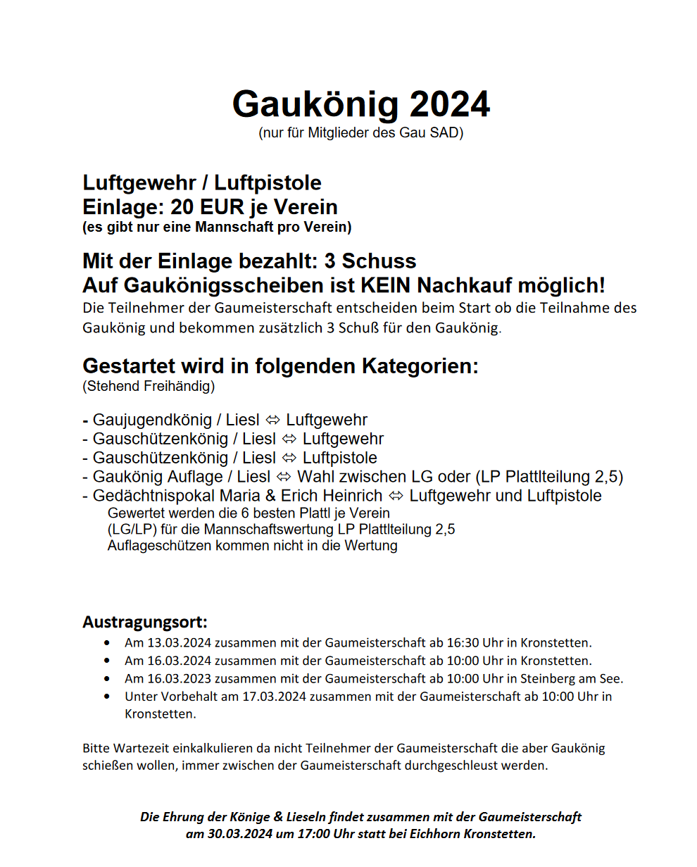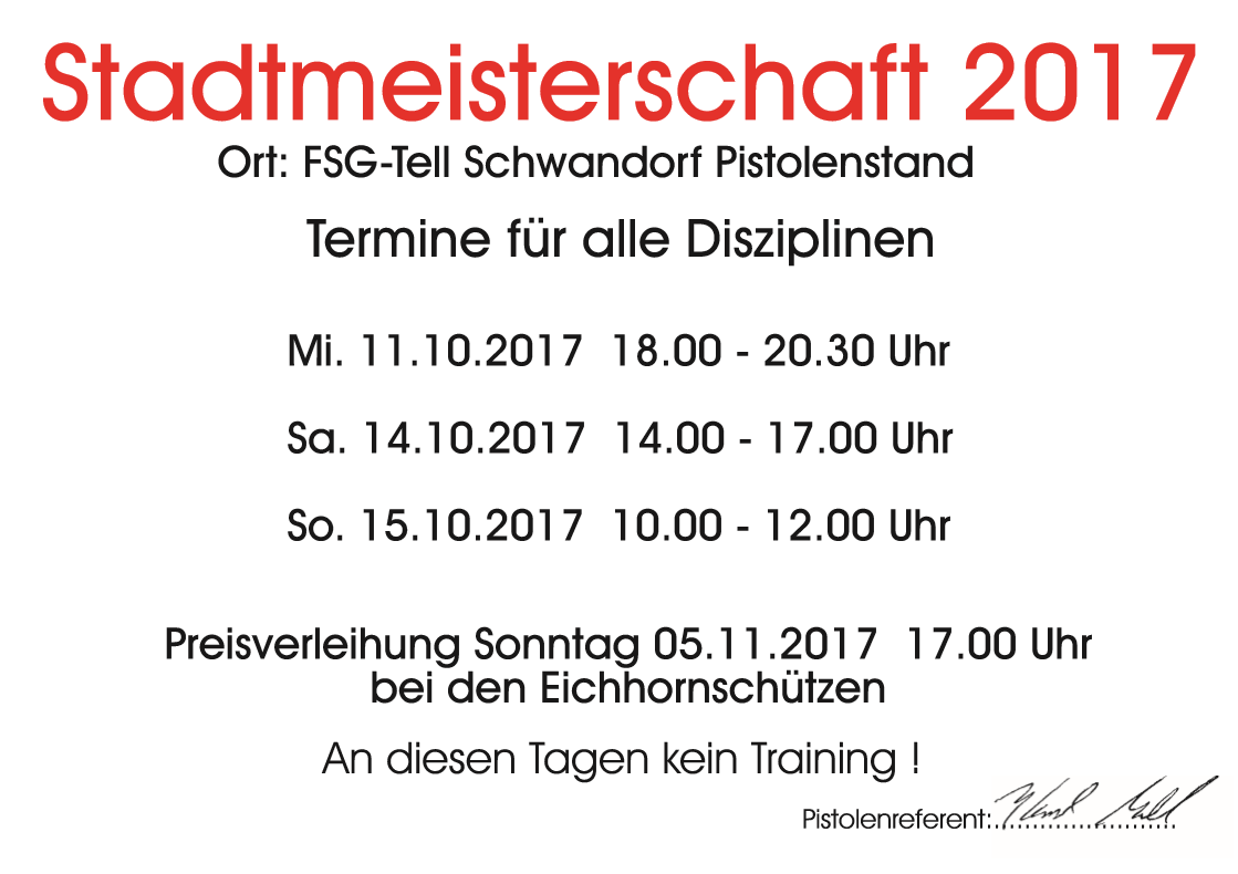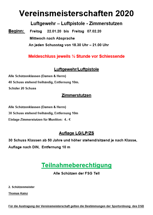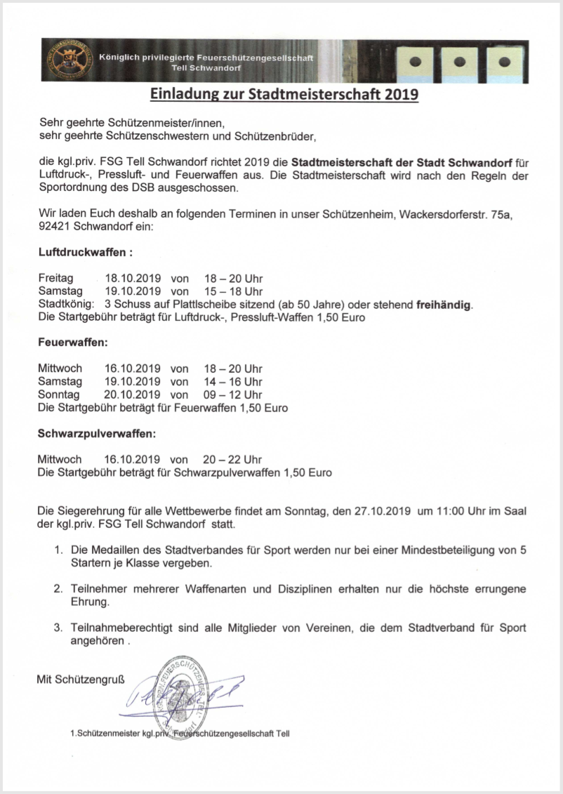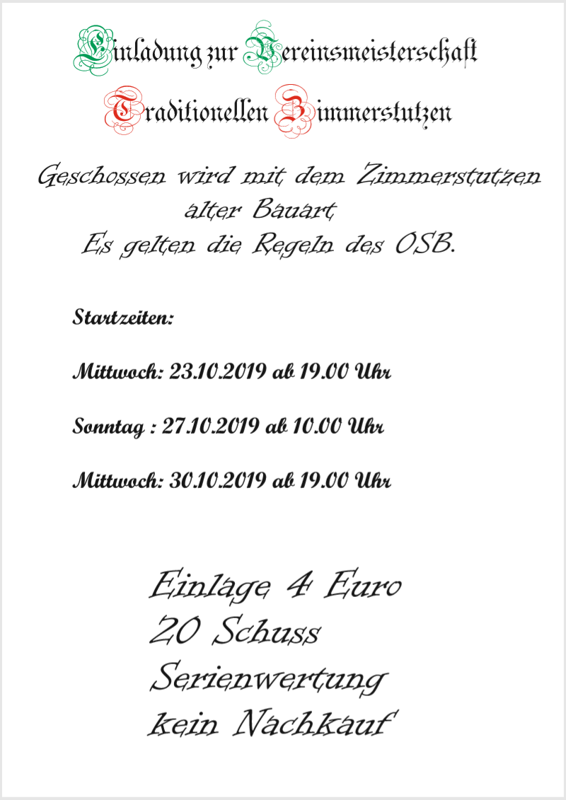 Geschossen werden jeweils 13 Schuss mit 9mm Pistole auf 25m und halbautomatische Büchse auf 100m. Die besten 10 Schuss werden gewertet. Es gibt Mannschafts- und Einzelwertung. Eine Manschafft besteht aus drei Personen. Benötigte Munition wird gestellt. Abfahrt am 02.10. um 8:00 am Schützenheim. Interessenten bitte beim Schützemeister oder Schießleiter melden.