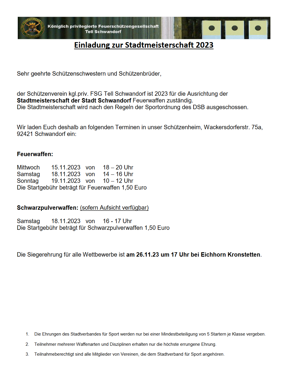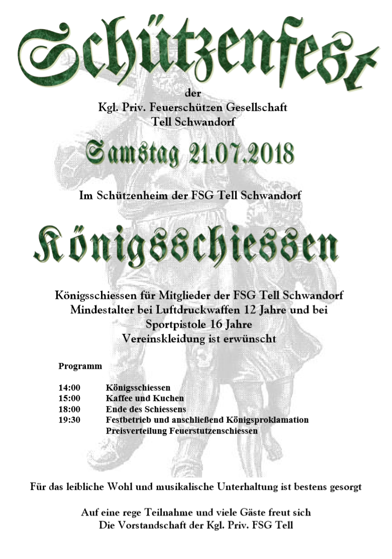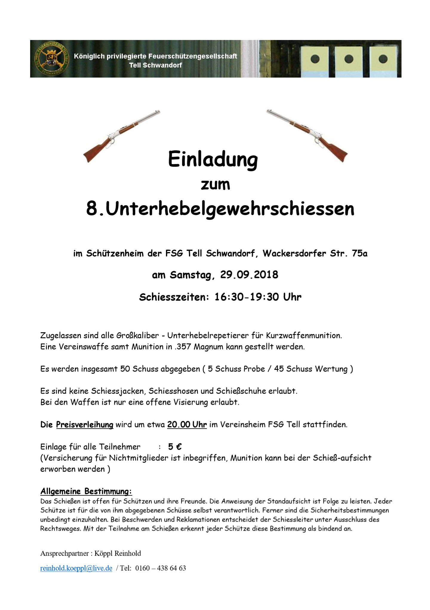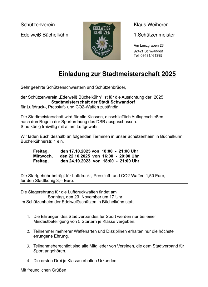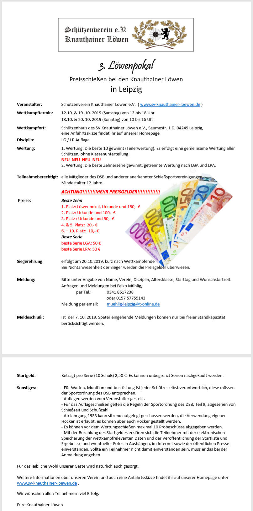 Geschossen werden jeweils 13 Schuss mit 9mm Pistole auf 25m und halbautomatische Büchse auf 100m. Die besten 10 Schuss werden gewertet. Es gibt Mannschafts- und Einzelwertung. Eine Manschafft besteht aus drei Personen. Benötigte Munition wird gestellt. Abfahrt am 02.10. um 8:00 am Schützenheim. Interessenten bitte beim Schützemeister oder Schießleiter melden.