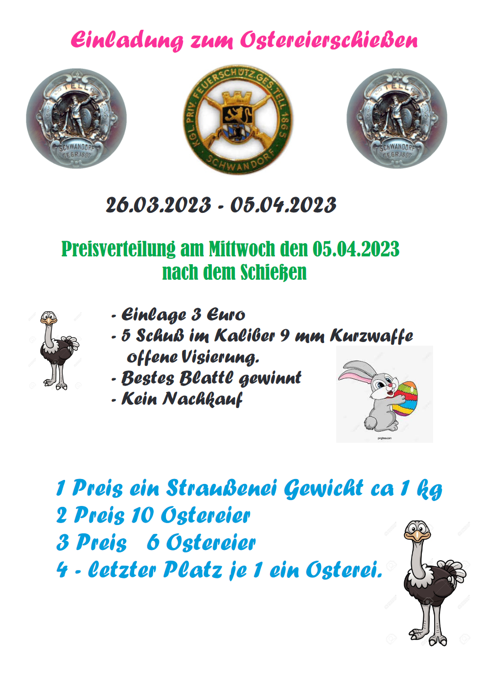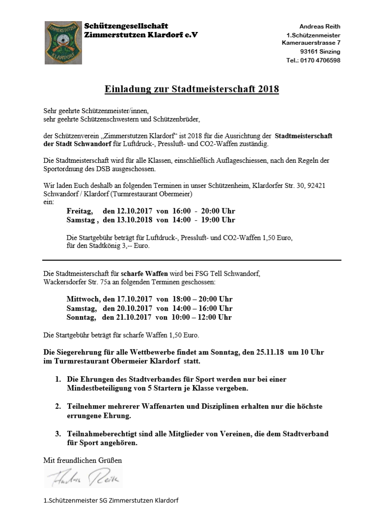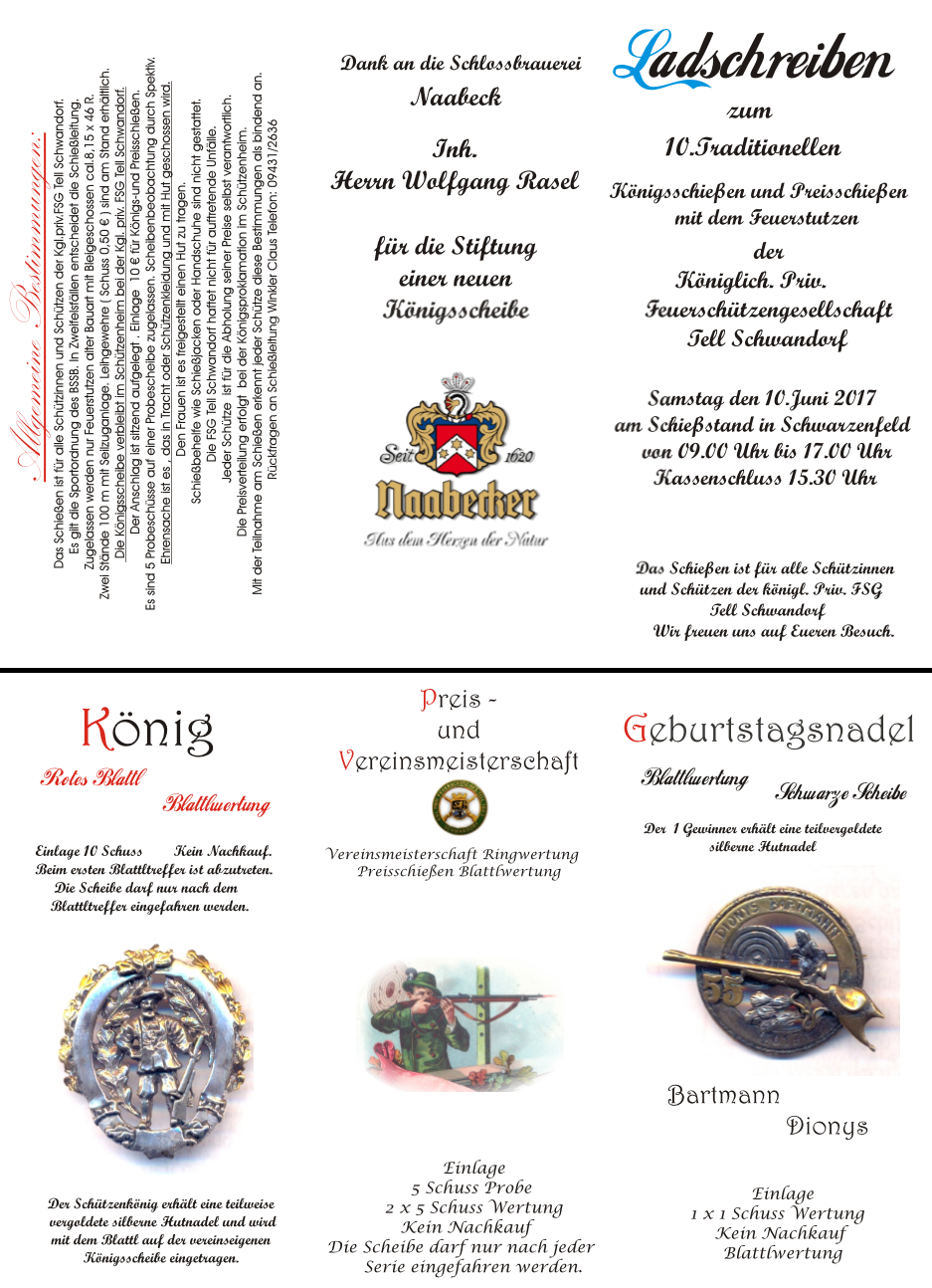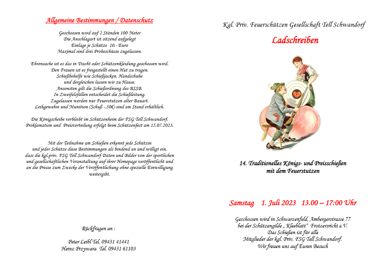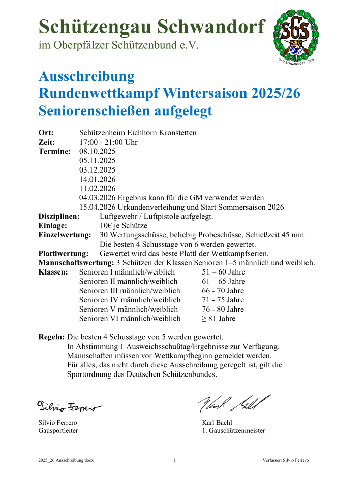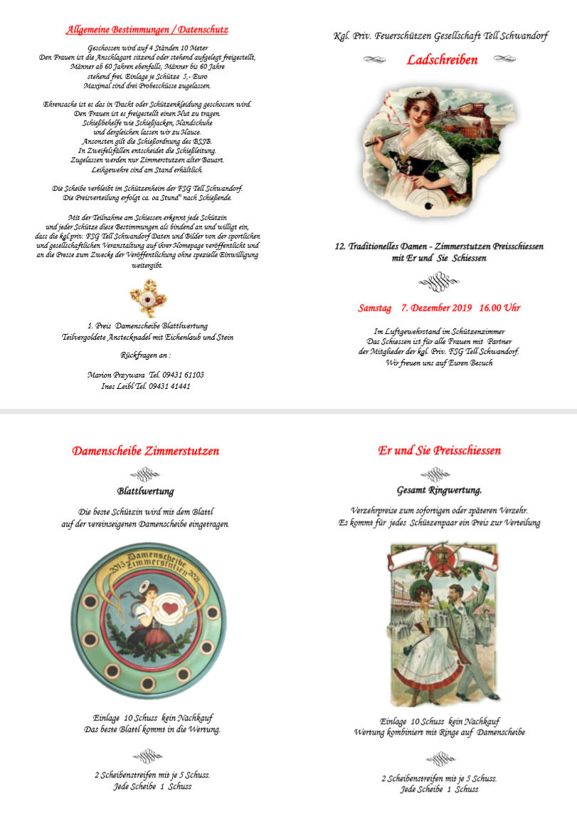 Geschossen werden jeweils 13 Schuss mit 9mm Pistole auf 25m und halbautomatische Büchse auf 100m. Die besten 10 Schuss werden gewertet. Es gibt Mannschafts- und Einzelwertung. Eine Manschafft besteht aus drei Personen. Benötigte Munition wird gestellt. Abfahrt am 02.10. um 8:00 am Schützenheim. Interessenten bitte beim Schützemeister oder Schießleiter melden.