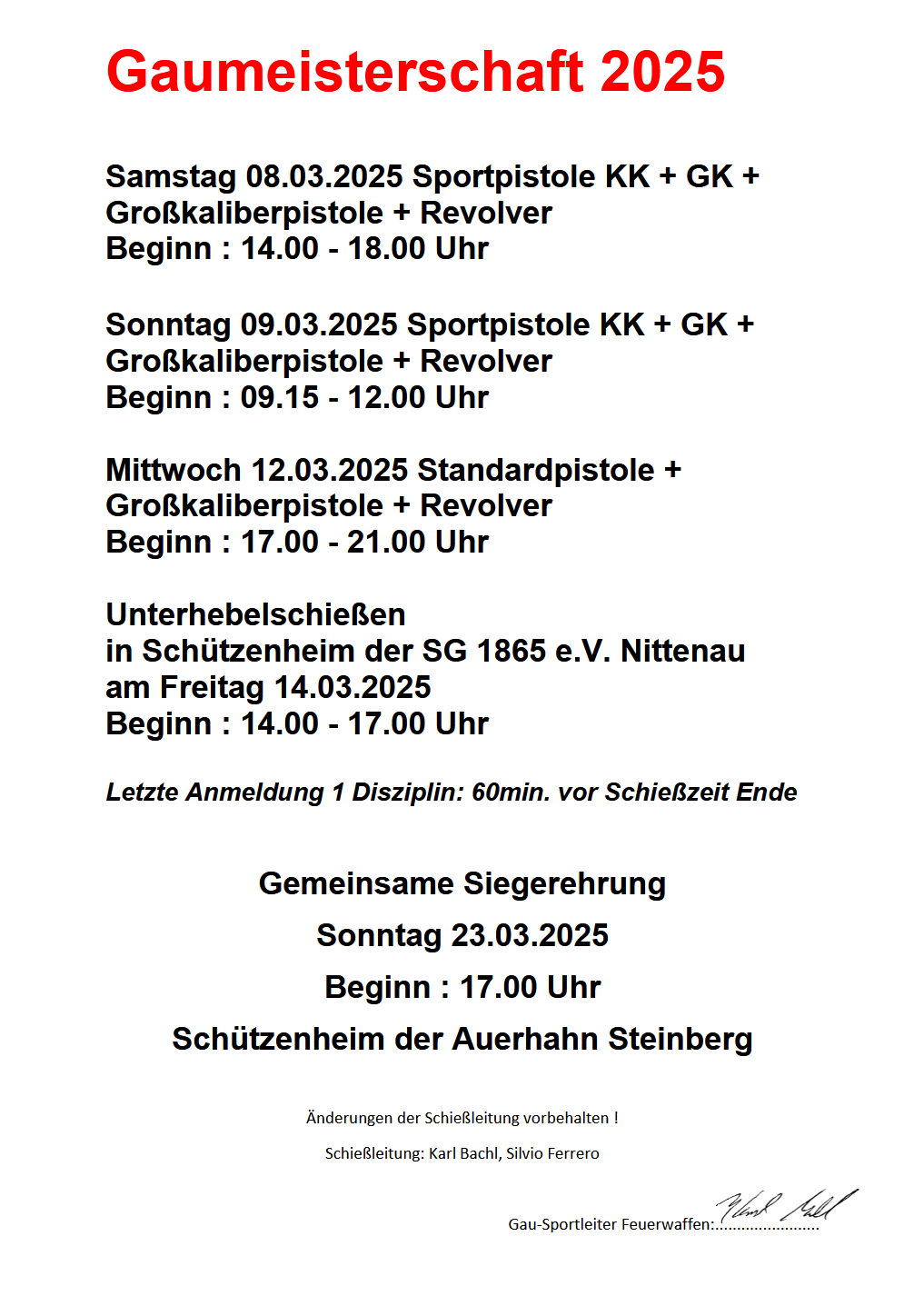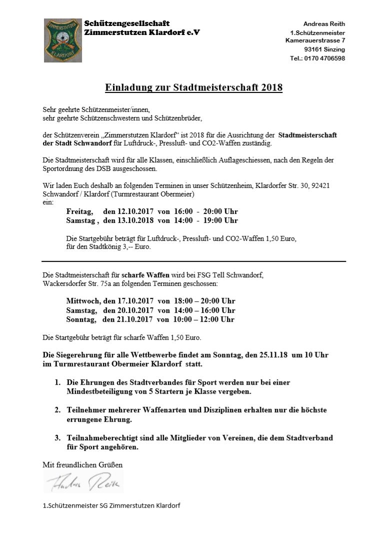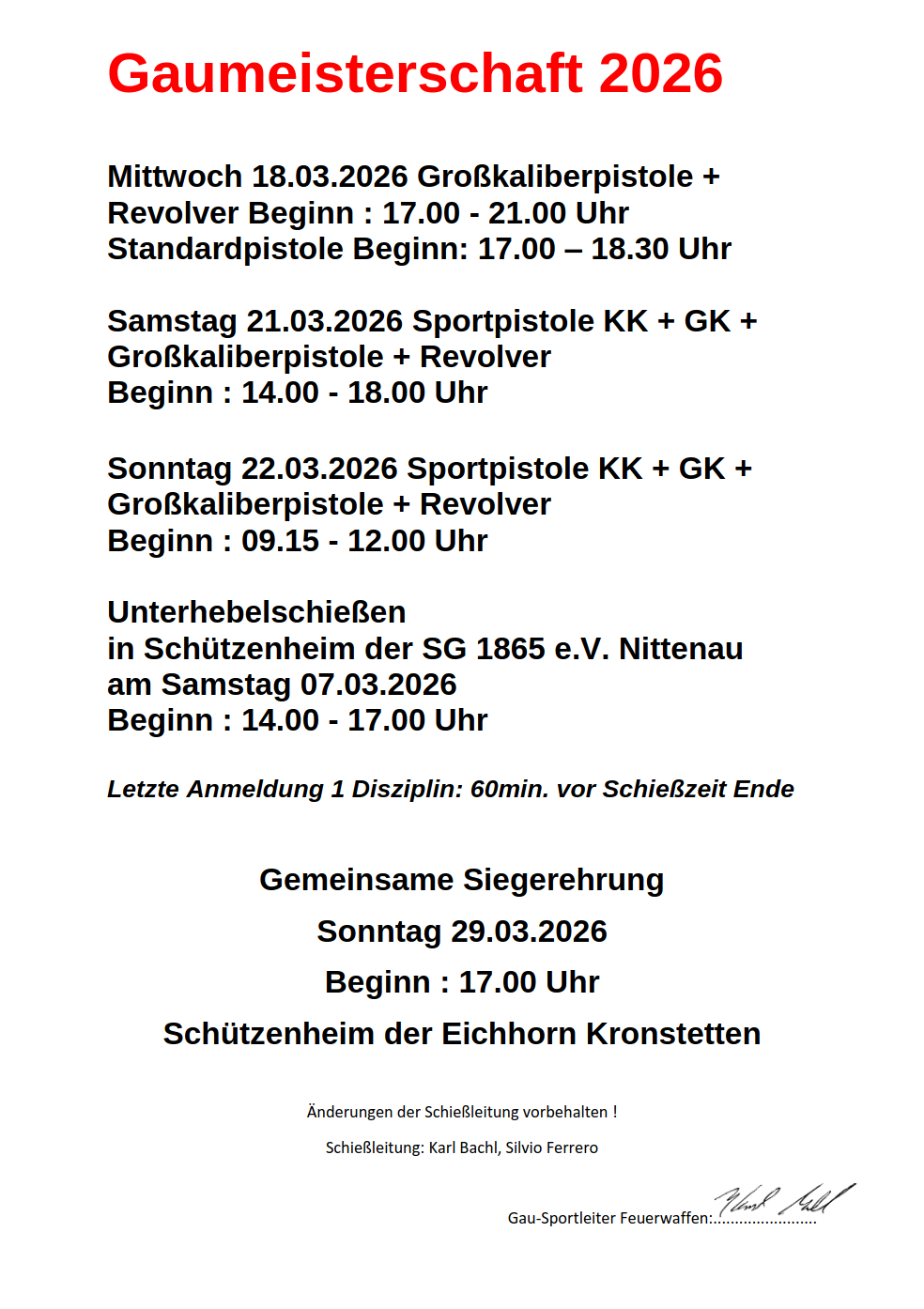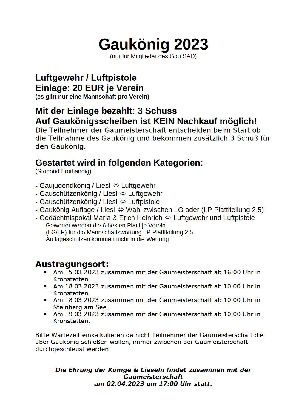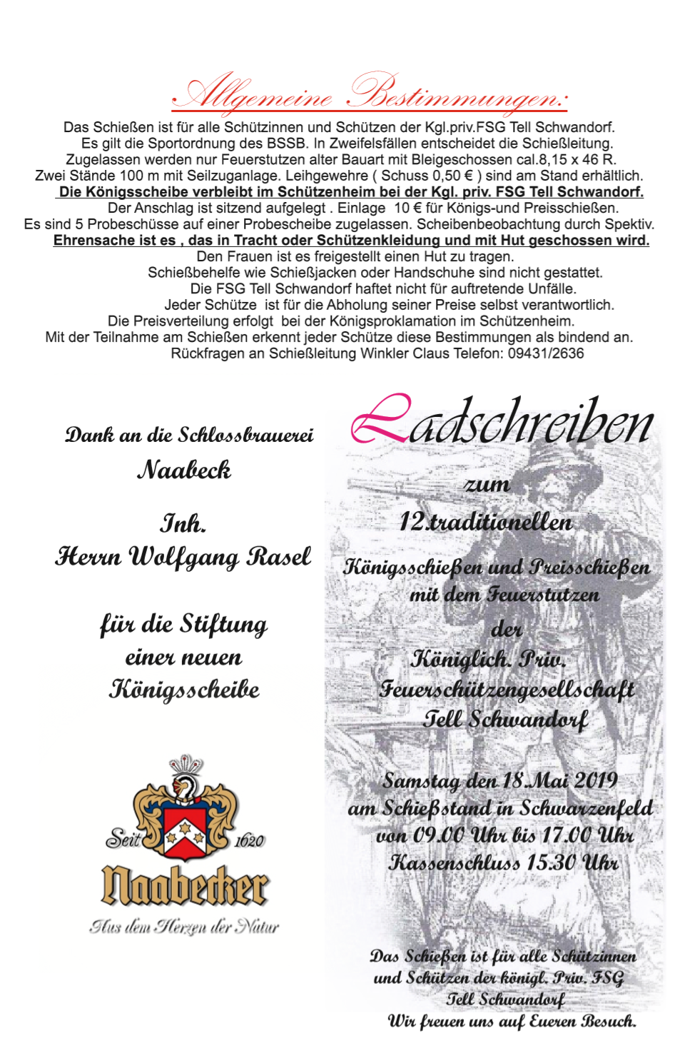 Geschossen werden jeweils 13 Schuss mit 9mm Pistole auf 25m und halbautomatische Büchse auf 100m. Die besten 10 Schuss werden gewertet. Es gibt Mannschafts- und Einzelwertung. Eine Manschafft besteht aus drei Personen. Benötigte Munition wird gestellt. Abfahrt am 02.10. um 8:00 am Schützenheim. Interessenten bitte beim Schützemeister oder Schießleiter melden.