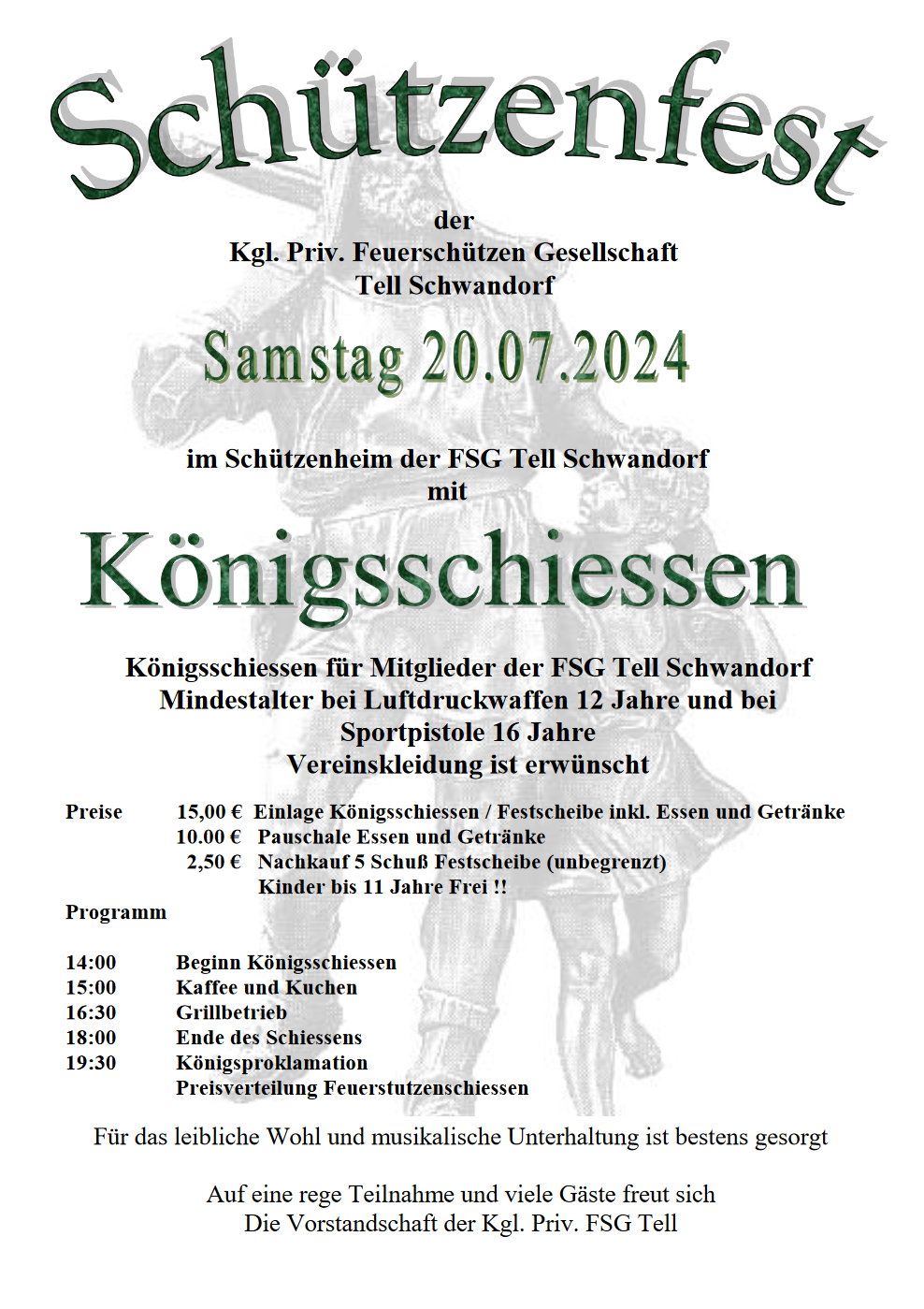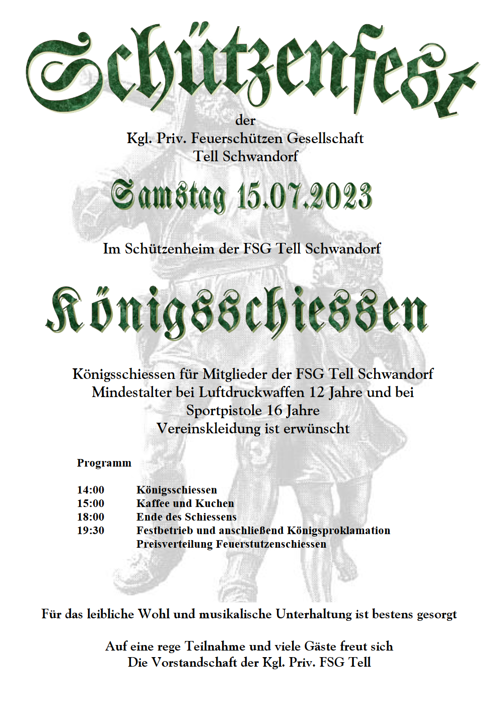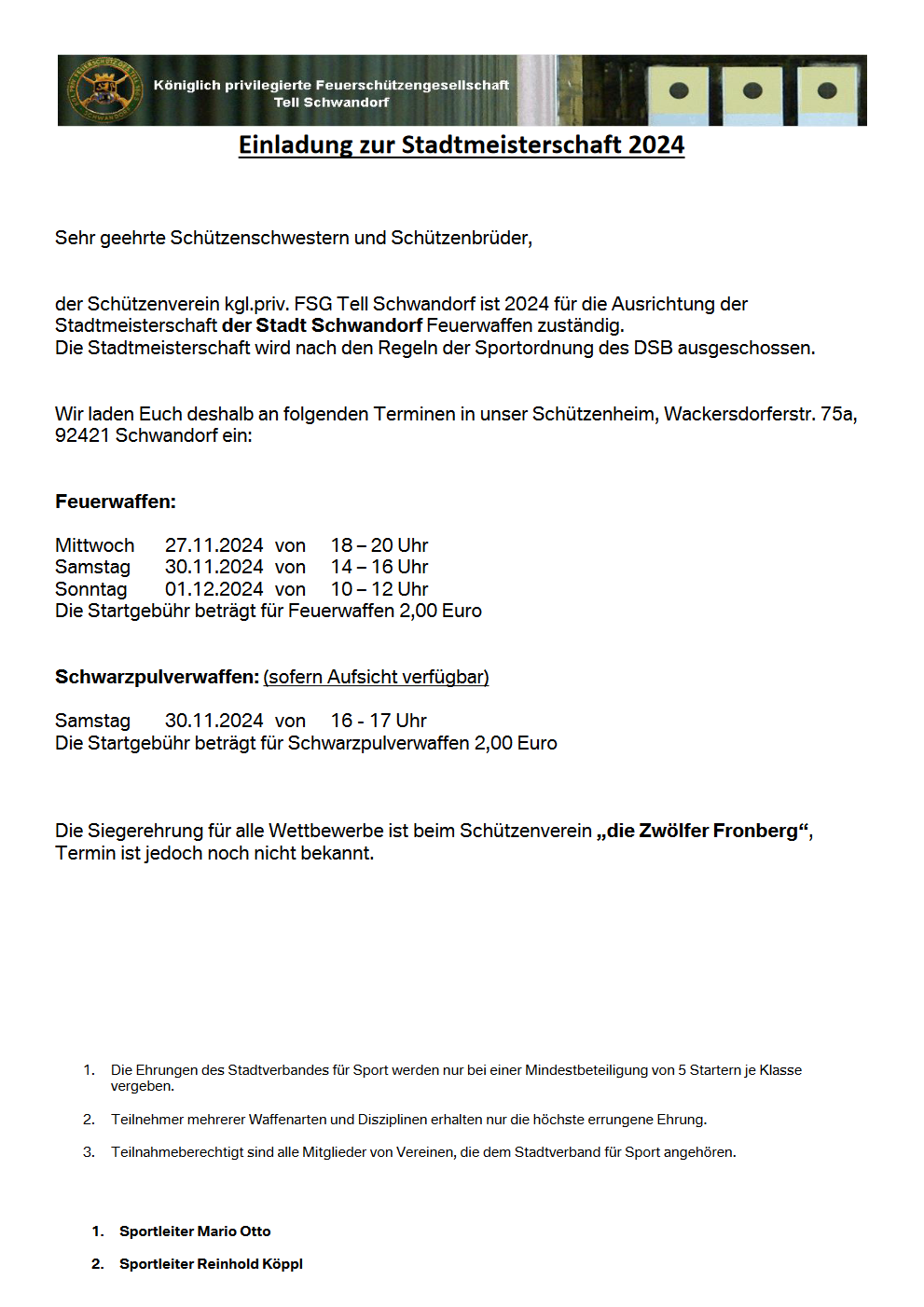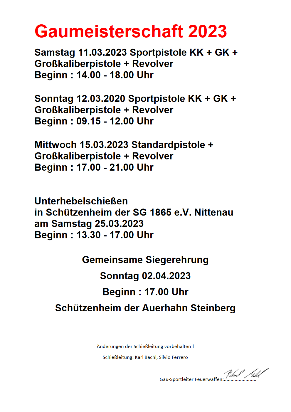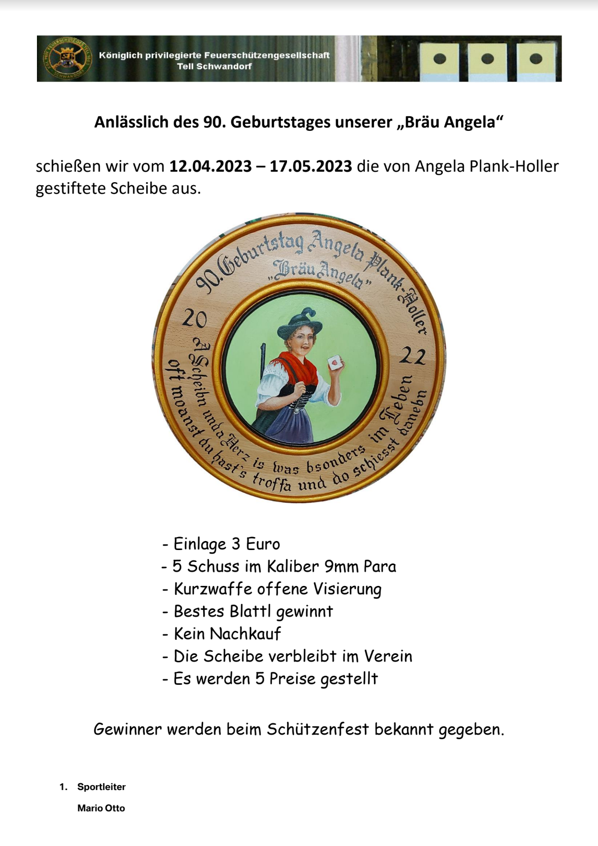 Geschossen werden jeweils 13 Schuss mit 9mm Pistole auf 25m und halbautomatische Büchse auf 100m. Die besten 10 Schuss werden gewertet. Es gibt Mannschafts- und Einzelwertung. Eine Manschafft besteht aus drei Personen. Benötigte Munition wird gestellt. Abfahrt am 02.10. um 8:00 am Schützenheim. Interessenten bitte beim Schützemeister oder Schießleiter melden.
