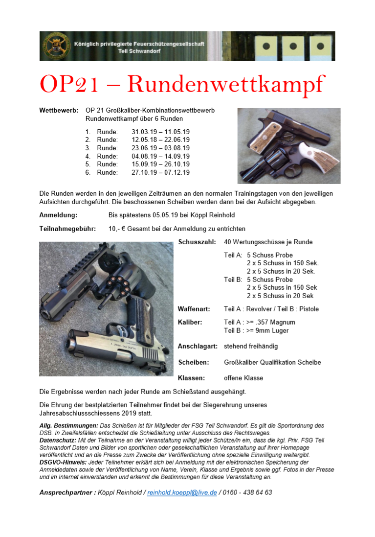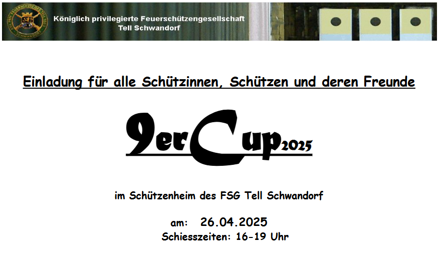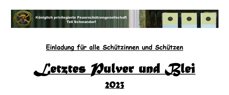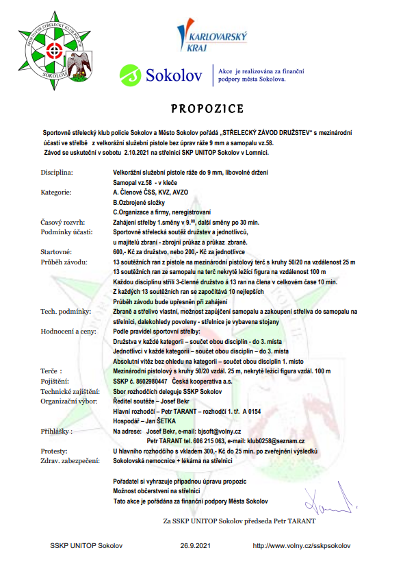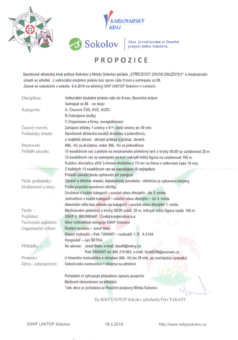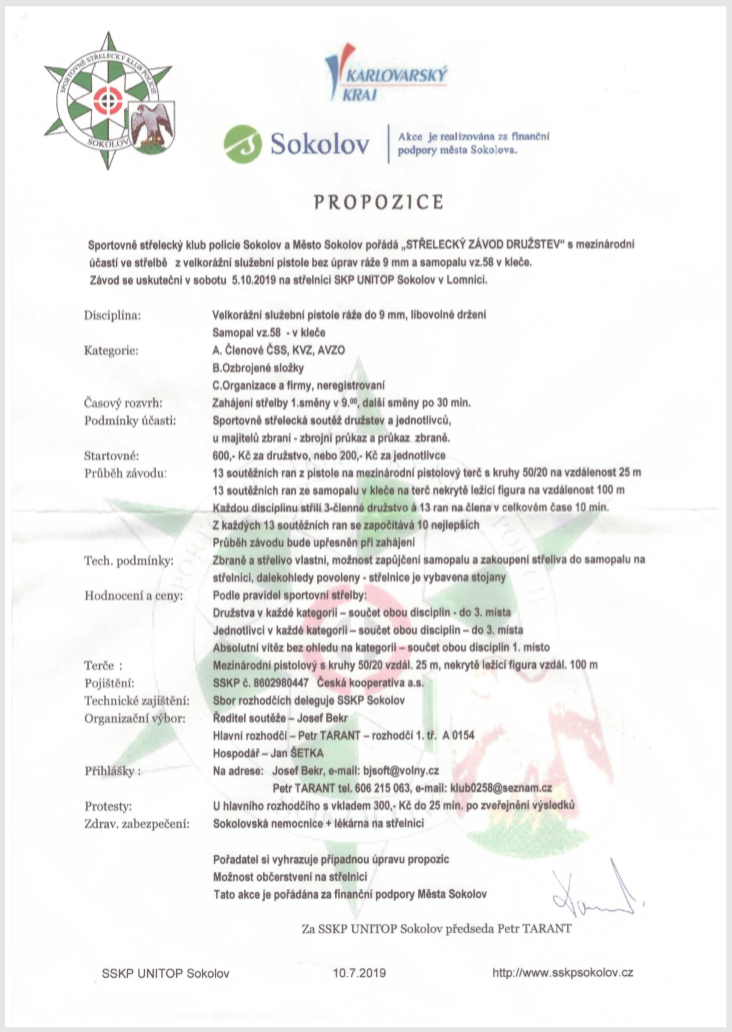 Kombinierter Wettkampf mit Pistole 9mm (25m) und Gewehr 7,62mm (100m) am 2. April bei unseren Freunden in Sokolov. Es werden jeweils 13 Schuß abgegeben. Die besten 10 Schuß werden gewertet. Mannschafts- und Einzelwertung. Eine Mannschaft besteht aus drei Schützen. Interessensbekundungen und Informationen beim 1. SM. der FSG Tell.